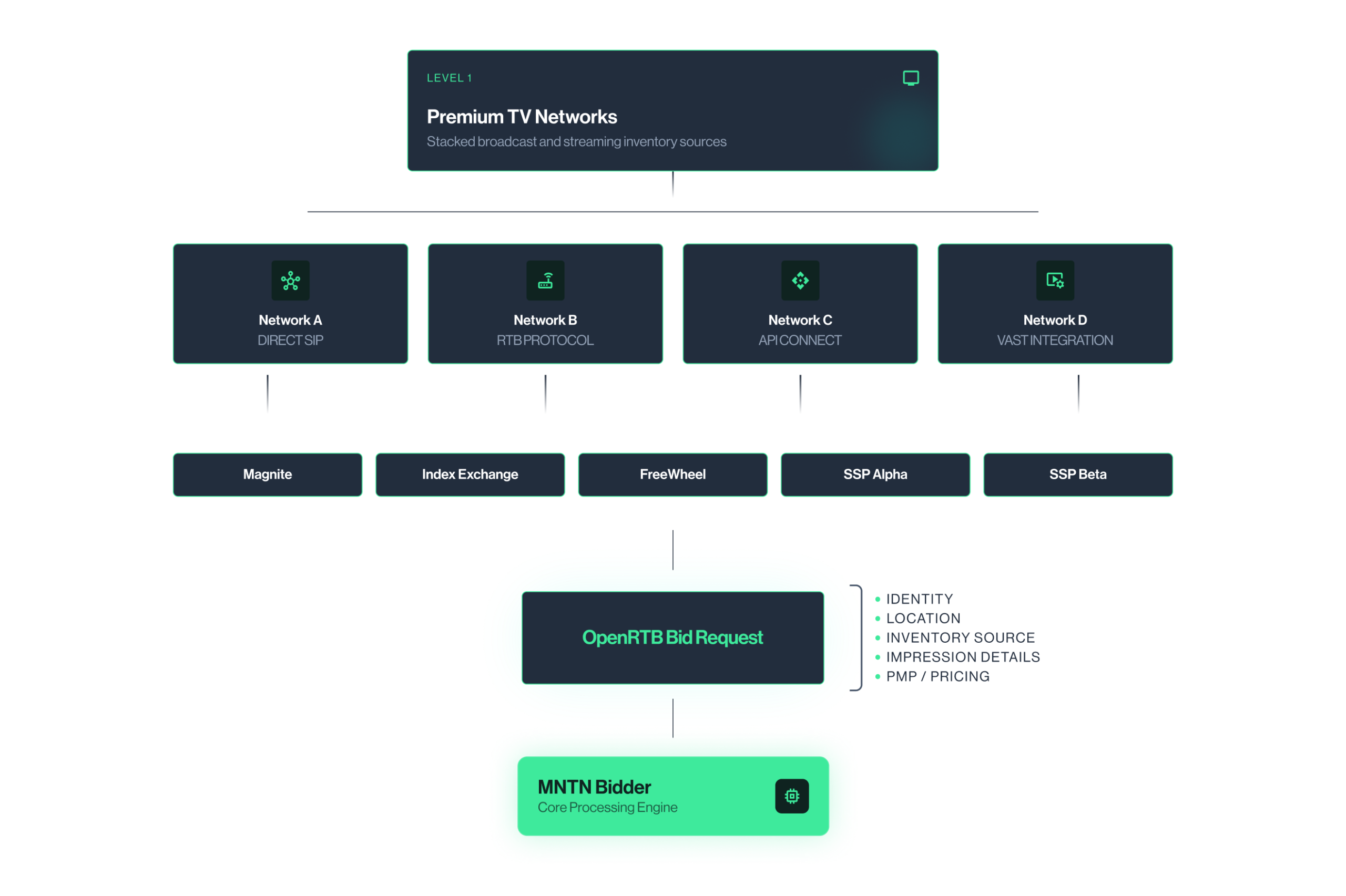 The bidding system natively supports inventory buying from private marketplace (PMP) deals. Since MNTN has strong partnerships with numerous networks, the ability to bid on that network inventory into PMP deals was a pillar of the system’s architecture from its inception.