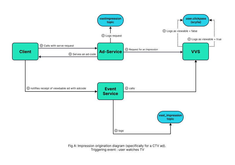 Fig A: Impression origination diagram (specifically for a CTV ad). Triggering event: user watches TV
