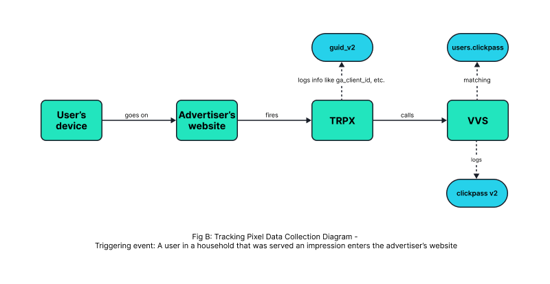 Fig B: Tracking Pixel Data Collection Diagram – Triggering event: A user in a household that was served an impression enters the advertisers website