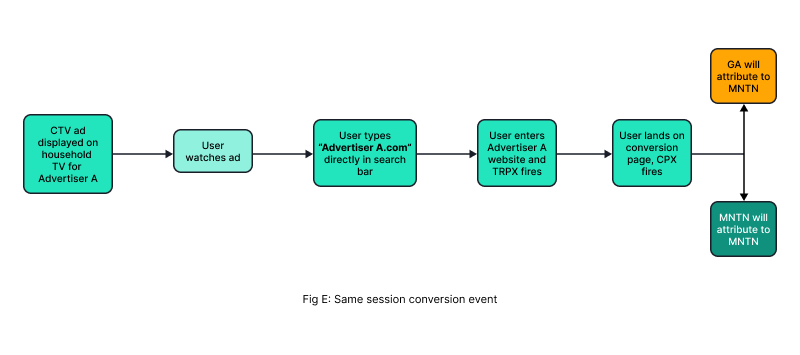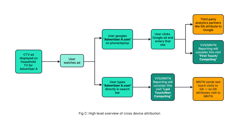 - Attribution may differ by platform: For example, if a user sees an ad from another channel, then watches a CTV ad, then visits the advertiser’s website and converts, GA4 will attribute the conversion to the first-touch it recorded (the other channel). In contrast, MNTN will credit the conversion to CTV (its own first touch) — offering a more complete view of its influence across the funnel.