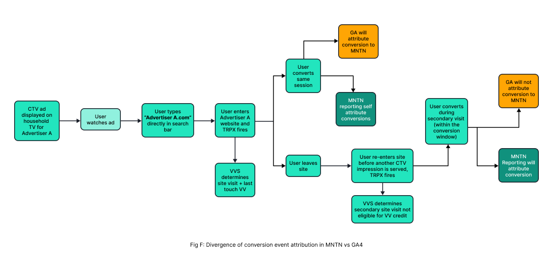 FigF: divergence of conversion event attribution in MNTN vs GA4