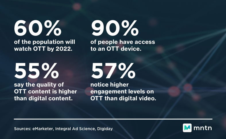 If you’re still a little confused by the OTT/CTV definition, you can also think of providers like Hulu, Netflix, Amazon Prime Video, and Roku, where all you need is WiFi to connect to your favorite TV shows, and you’re good to go.